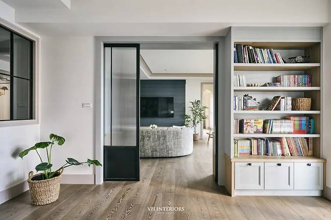 서재는 필요에 따라 열고 닫을 수 있는 유연한 공간입니다. 유리 슬라이딩 도어를 사용해 독립성과 개방감을 동시에 제공합니다.
