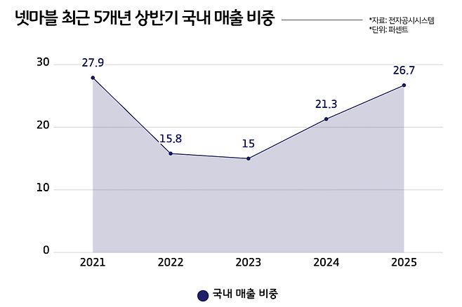 최근 5년간 상반기 전체 매출에서 국내 매출이 차지하는 비중을 보면 추세가 뚜렷하다. 2021년 27.9%였던 국내 매출 비중은 2022년 15.8%, 2023년 15%로 줄어들며 해외 의존도가 커졌다. 하지만 지난해 21.3%로 소폭 반등한 데 이어 올해는 26.7%로 뛰어올라 2021년 수준을 회복했다. 국내 시장의 회복세가 분명히 나타난 것이다.