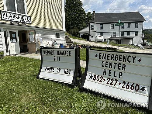 Signs are displayed outside the town hall, Sunday, July 14, 2024, in Plainfield, Vt., a community that had some of the worst damage in last week's flooding. (AP Photo/Lisa Rathke)