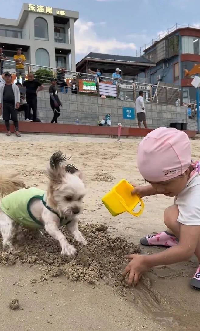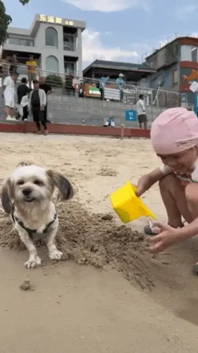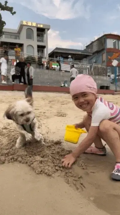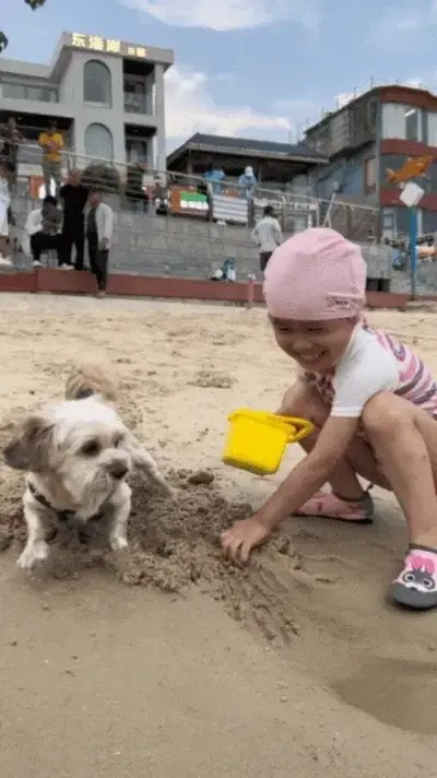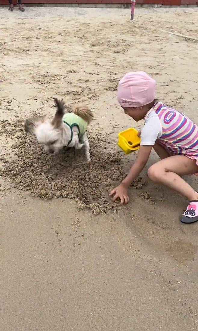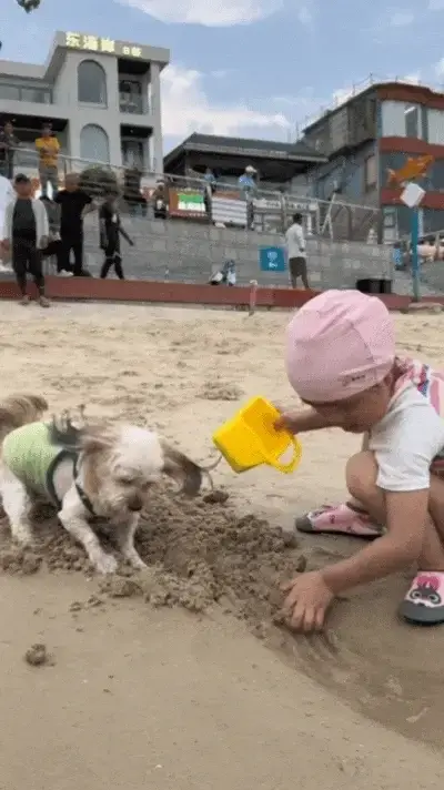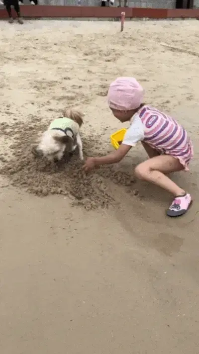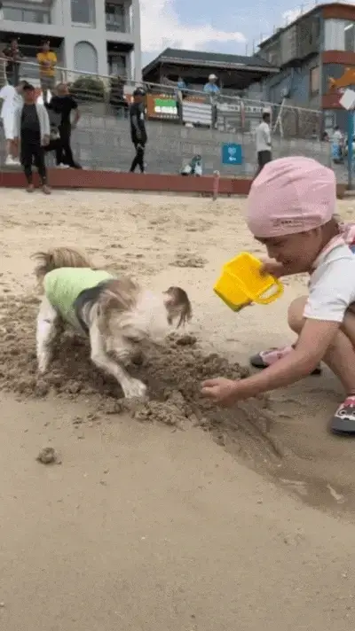 어린 주인과 함께하는 모래 놀이에서 강아지는 놀라운 열정과 헌신을 보여주고 있습니다.