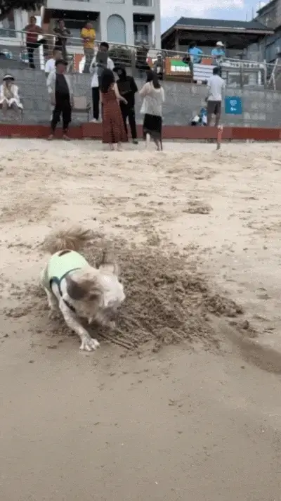 강아지의 모래 파기 본능이 온전히 담긴 장면이 포착되었습니다.
