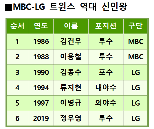 MBC 청룡과 LG 트윈스는 지금까지 총 6명의 신인왕을 배출해 '신인왕의 산실'로 꼽히고 있다. 구단 역대 신인왕 리스트에서 김건우가 1호로 맨 위에 자리 잡고 있다. 이는 세월이 아무리 흘러도 변치 않을 역사적 사실이다.
