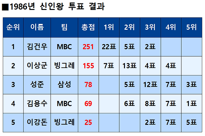 김건우는 229.2이닝 던지면서 18승6패(다승 4위), 평균자책점 1.86(5위), 승률 0.750(4위)의 압도적 성적을 올렸다. 신인 중 유일하게 신인왕 후보는 물론 MVP 후보에도 올랐다. 김용수도 신인왕 자격이 있었고, 빙그레 이강돈은 타율 0.297(6위), 9홈런(10위)의 성적으로 타자로는 유일하게 신인왕 후보가 됐다.