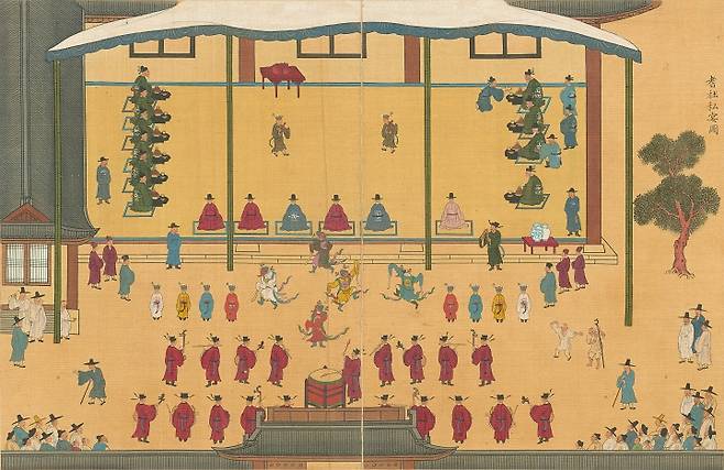 숙종(재위 1674-1720)이 59세가 된 1719년에 기로소(耆老所)에 들어간 것을 기념해 제작한 화첩인 ‘기사계첩(耆社契帖)’ 속 연희 장면을 보면 오방색을 입은 5명의 광대가 처용무를 추고 있습니다. 그래서 처용무를 오방처용무라고도 부릅니다. 오방처용무는 5명의 춤꾼이 동(청), 남(홍), 중앙(황), 서(백), 북(흑)에서 춤을 추는 군무를 일컫습니다.