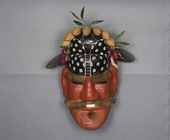 처용무는 원래 적색 가면에 검은색 옷차림을 한 1인무였다고 합니다. 그러던 것이 세종대에 더욱 발전 변모돼 오방처용무로 확대됐고 악곡과 가사까지 개선됐습니다. 5명의 춤꾼은 각각 복색은 다르지만 처용탈은 동일합니다. 처용탈은 팥죽색 피부가 특징이며 양쪽 귀에는 납구슬이나 주석 고리를 겁니다. 머리에 쓴 검은색 모자 위에는 귀신을 쫓는(辟邪·벽사) 7개의 복숭아와 부귀를 상징하는(進慶·진경) 모란꽃 2송이를 꽂습니다. 처용탈을 쓰는 것 그 자체가 바로 액은 막고 복을 빌어주는 벽사진경을 드러낸 것입니다.