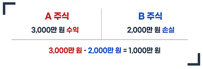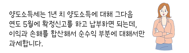 다시 말해 같은 해에 발생한 양도차익(+ 수익)과 양도차손(- 수익)을 합산하여 순수익 부분에 대해서만 과세한다는 것인데, 이를 손익통산이라고 합니다.