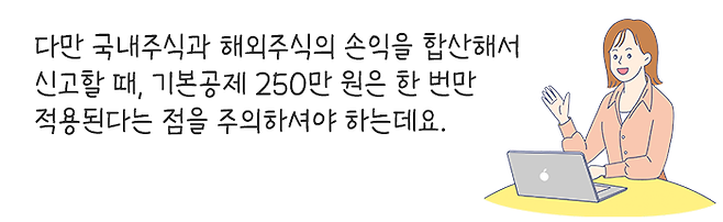 국내주식과 해외주식의 손익에서 각각 250만 원을 공제하는 것이 아니라 한 해 동안 국내주식과 해외주식의 손익을 모두 합산한 소득에서 250만 원을 한 번만 공제할 수 있습니다.