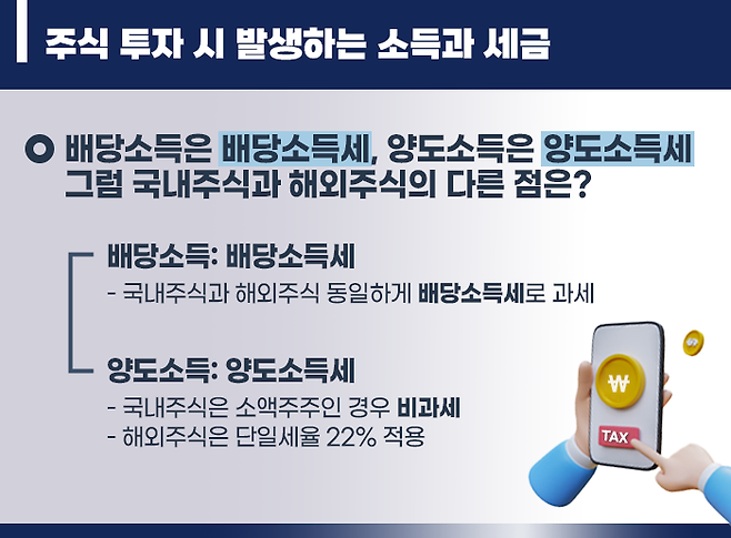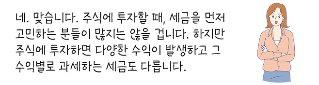 그래서 오늘은 주식 투자 시 발생하는 세금과 국내주식∙해외주식의 과세방법은 무엇이 다른지에 대해 살펴보도록 하겠습니다. 그리고 세금은 어떻게 줄일 수 있는지도 알아보겠습니다.