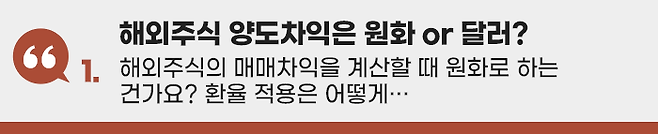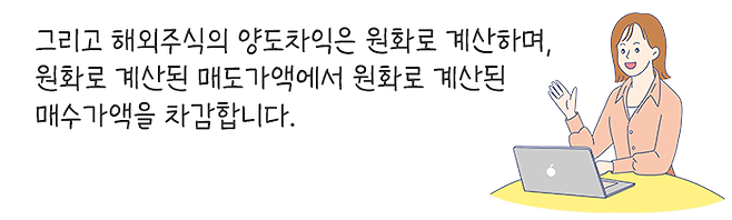 원화로 계산해야 하기 때문에 매도와 매수 결제일의 환율이 적용되는데, 간혹, 개인의 경우 ‘환차익은 과세대상’이 아니라고 생각하는 경우가 있어 주의가 필요합니다.