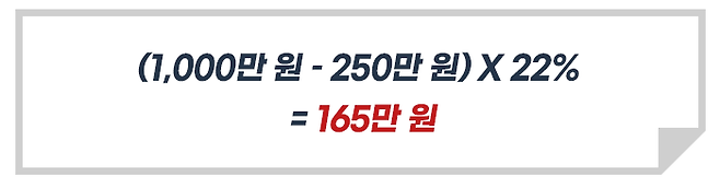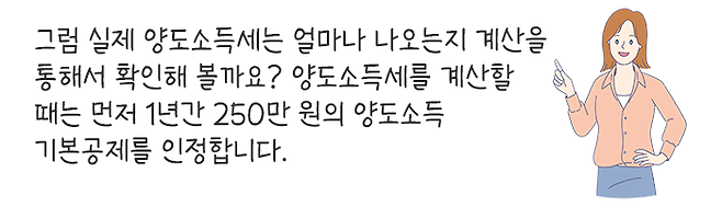 연간 양도차익이 1,000만 원이라면 양도소득 기본공제 250만 원을 차감한 후 750만 원이 양도소득 과세표준이 됩니다.