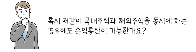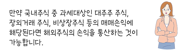 대주주에 해당하거나 장외거래하거나 비상장주식을 거래할 경우에만 양도소득세 과세대상이 되므로 단순히 평가손실인 국내주식을 장내에서 매도하면 해외주식과 손실상계를 할 수 없습니다.
