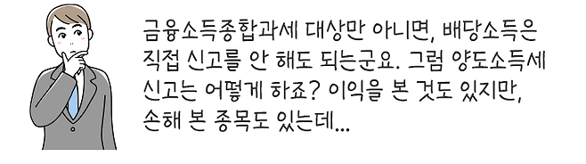 예를 들어 비상장주식(국내주식)을 5월에 매도하여 200만 원 손실이 발생하고 해외주식을 10월에 매도하여 300만 원 이익이 발생했다면, 비상장주식(국내주식)은 7~8월에 손실신고를 하고 다음 해 5월에 비상장주식(국내주식)과 해외주식의 손익을 합산한 100만 원에 대해 확정신고를 하는 것입니다.