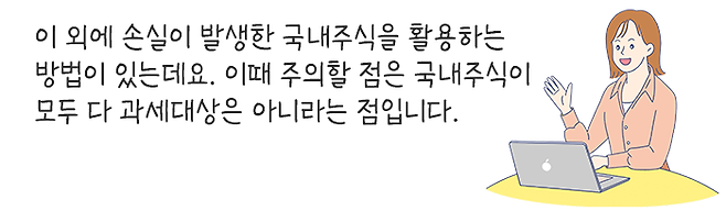 보통의 소액주주가 활용할 수 있는 방법은 보유한 손실 종목을 장외거래한다면 과세대상 양도손실이 되므로 해외주식의 이익과 상계할 수 있습니다.