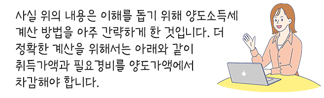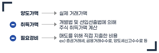 그리고 매수∙매도 시 직접 지출한 필요경비(증권거래세, 금융거래수수료, 양도세신고수수료 등)를 차감하여 양도차익을 계산합니다.