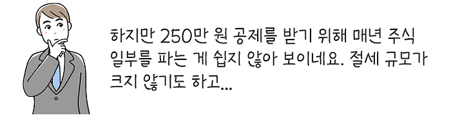2024년 12월에 주식의 절반을 매도하여 250만 원의 차익을 실현하고, 2025년 1월에 나머지 절반을 매도하여 250만 원의 차익을 분산 실현하면 양도소득세를 내지 않아도 된다는 의미입니다.