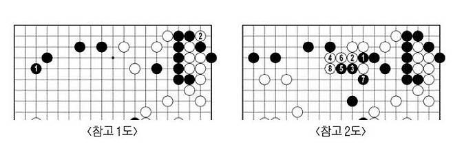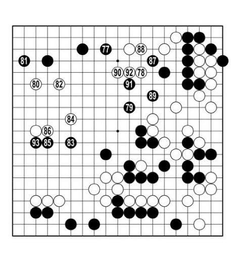 흑79로 <참고 1도> 1에 둘 틈이 없다. 백이 2로 끊어 흑 대마를 몰아붙인다. 이길 확률 90%를 넘긴 백은 왼쪽에서 집을 더 불릴 생각이 없었다. 흑89로는 <참고 2도> 1로 나가 3에 끊는 것이 차이를 좁히는 길이었다. 백90에 두니 또 편해졌다.