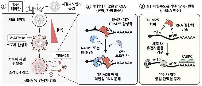 | ▲ mRNA 백신의 주요 세포 조절 경로와 N1-메틸수도유리딘 변형 염기 효과의 분자 기전 ① mRNA 백신의 세포 전달 및 발현 조절. 세포막에 있는 황산 헤파란이 지질나노입자의 세포 내 유입을 촉진하며, V-ATPase 양성자 이온 펌프가 소포체 내부의 산성화와 소포체 막의 파열을 유도한다. 이를 통해 지질나노입자에 감싸진 mRNA가 단백질로 발현되기 위한 세포질 환경으로 방출될 수 있다. ② TRIM25에 의한 외인성 mRNA 억제. 소포체가 파열될 때 함께 방출된 양성자 이온에 의해 TRIM25가 활성화되어 외인성 RNA를 특이적으로 인지하고, 추가적인 인자들과 함께 신속한 RNA 분해를 유도한다. 이는 소포체를 통해 침입한 외부 물질에 대항하는 세포의 pH-의존적 방어 기전으로 작용한다. ③ N1-메틸수도유리딘 변형 염기의 효과. 변형 염기는 TRIM25의 RNA 결합력을 낮춰 TRIM25의 외래 물질 감시와 억제로부터 mRNA가 회피하도록 돕는다. 이를 통해 외인성 mRNA에서 발현되는 항원 단백질량을 증가시켜 mRNA 백신의 효능을 향상시킨다. |
