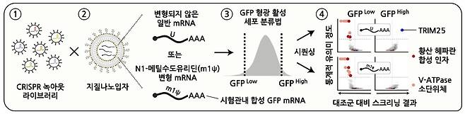 | ▲ mRNA 백신의 세포 조절 경로를 탐구하기 위한 크리스퍼 녹아웃 스크리닝 전략 ① 유전체 수준의 크리스퍼 녹아웃 스크리닝 라이브러리. 19,114개의 인간 유전자를 표적하는 개별 가이드 RNA(single guide RNA, sgRNA)로 구성돼 있다. ② mRNA 백신 개략도. 녹색 형광 단백질(GFP)을 암호화하는 mRNA를 합성하여 지질나노입자에 봉입한 후, 크리스퍼 라이브러리로 녹아웃된 세포에 전달했다. 일반 염기와 N1-메틸수도유리딘 변형 염기 mRNA를 각각 이용해 스크리닝을 진행했다. ③ GFP mRNA 전달 및 형광 분석. 녹아웃된 세포에 GFP mRNA를 전달한 뒤, GFP 형광이 높은 세포(GFPHigh)와 낮은 세포(GFPLow)를 분류했다. 이후 시퀀싱을 통해 각각의 세포에서 녹아웃된 개별 유전자를 밝혀냈다. ④ 스크리닝 결과 개략도. mRNA 백신의 전달 및 발현을 촉진하는 핵심 인자(황산 헤파란 합성 경로 및 V-ATPase 소단위체)와 억제 인자(TRIM25)를 규명했다. 특히, 변형 mRNA에서는 TRIM25가 관찰되지 않아, |