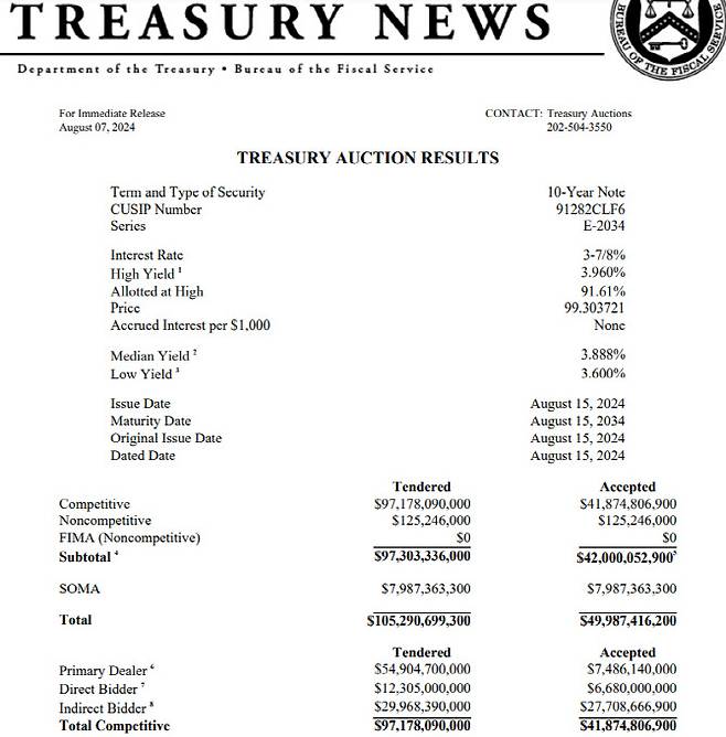 7일(현지시간) 재무부에 따르면 이날 420억달러 규모의 10년만기국채 입찰에서 발행금리는 3.96%를 기록했다.