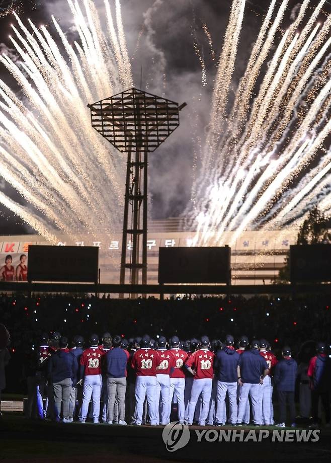 (부산=연합뉴스) 강덕철 기자 = 8일 부산 사직야구장에서 열린 롯데 자이언츠 영원한 4번 타자 이대호 'RE:DAEHO' 은퇴식에 불꽃놀이가 펼쳐지고 있다. 2022.10.8
