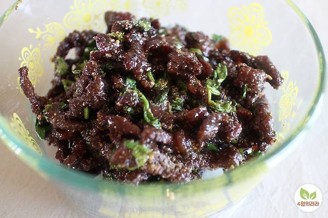 → 2차 양념(간장1T+조청1T+마늘+참기름+후추)을 넣어 조물조물 무침.