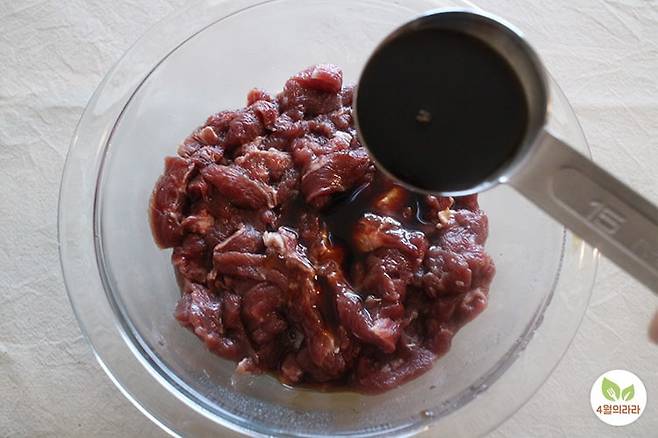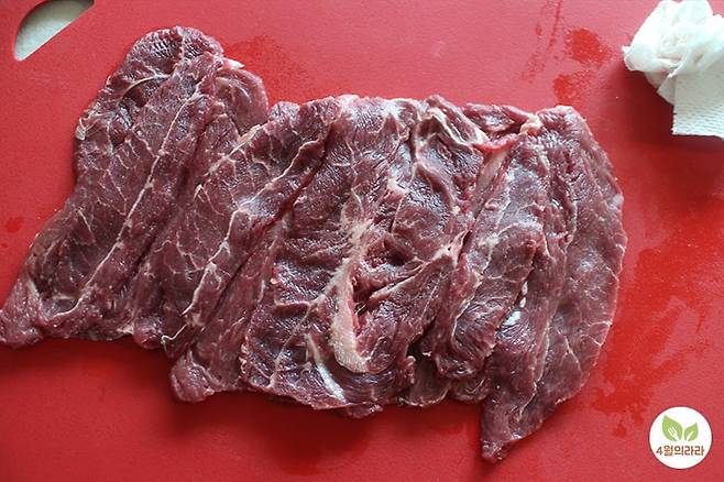 → 소고기 부채살을 준비했어요. 핏물을 제거하고 결 반대로 썰어야 씹는 맛이 살아나요.