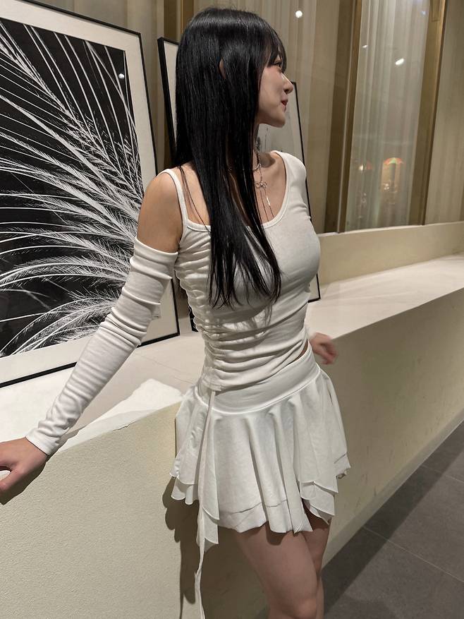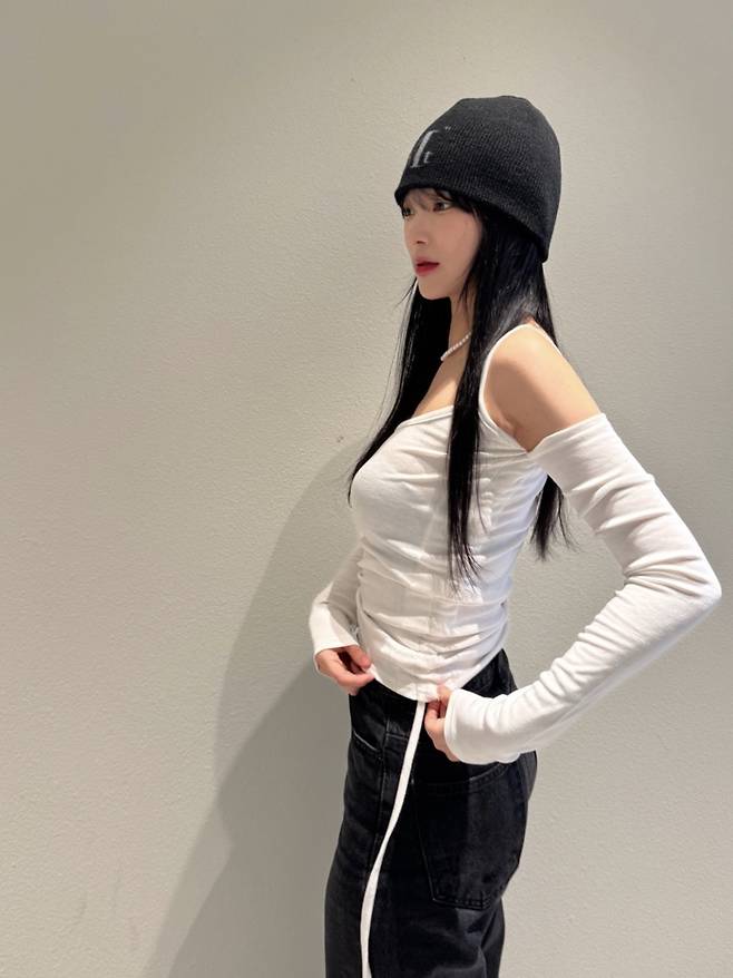두 번째 룩은 무채색 조합과 슬림한 실루엣으로 유니크함과 여성미를 동시에 잡은 룩.
