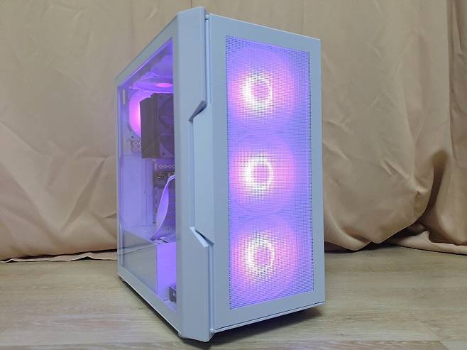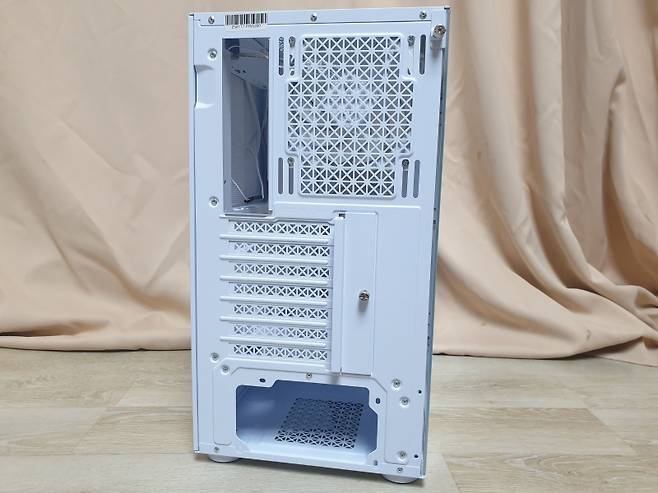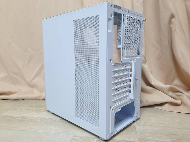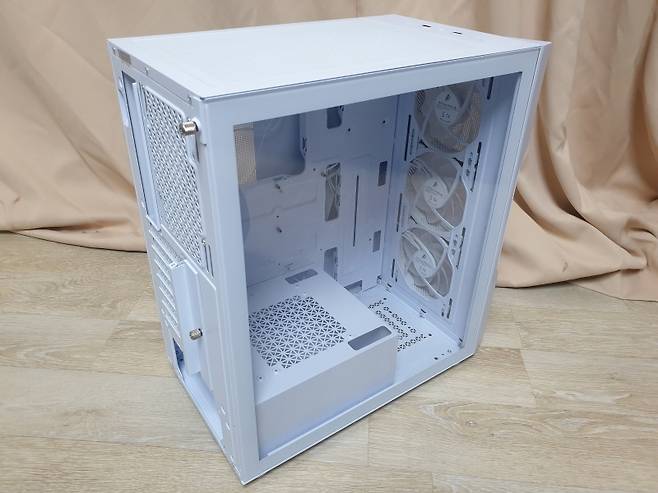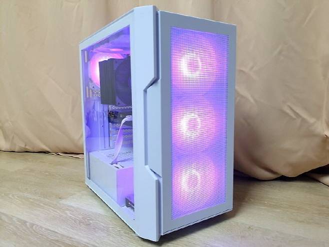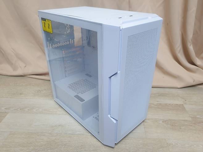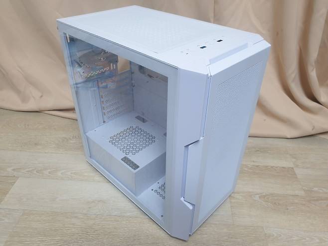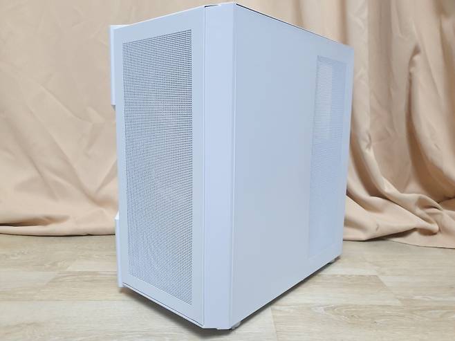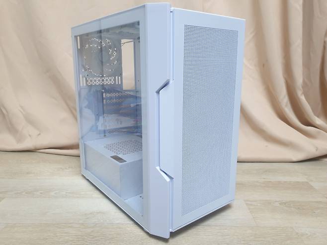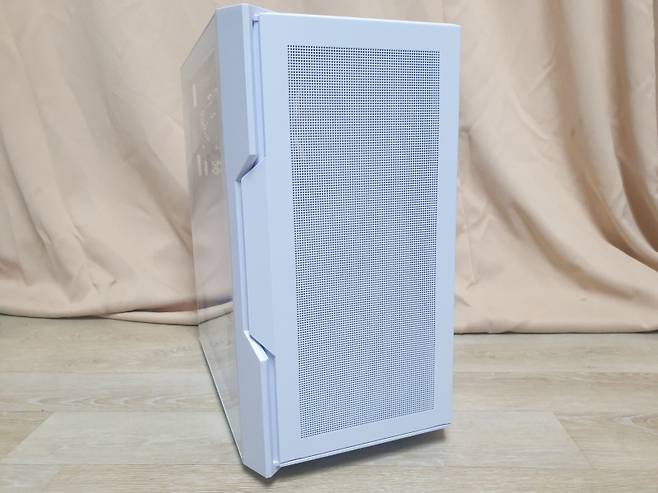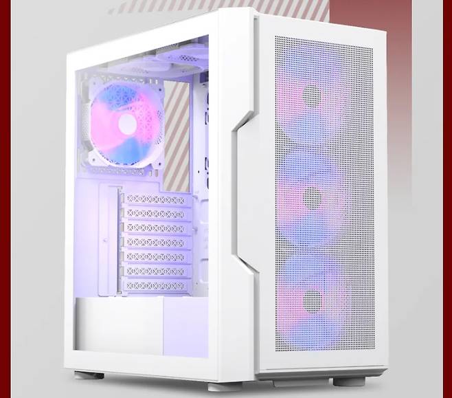 화이트 색상에 전면 메쉬 패널 디자인으로 측면 강화 유리를 장착한 미들 타워 케이스입니다.