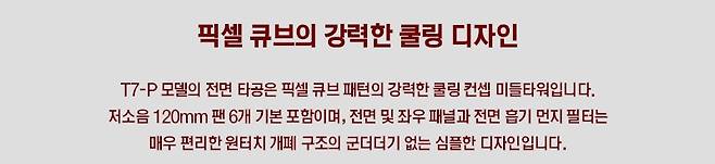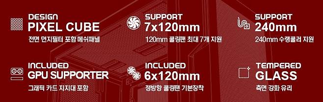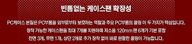 - 120mm RGB 쿨링팬 4개와 120mm Non-LED 쿨링팬 2개 기본 제공 (최대 7개 장착)