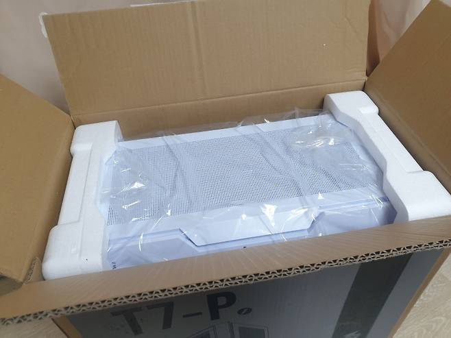 개봉해 보니 투명한 비닐 포장된 화이트 케이스가 보이고, 스티로폼으로 잘 고정되어 있습니다.