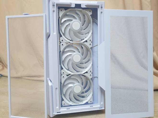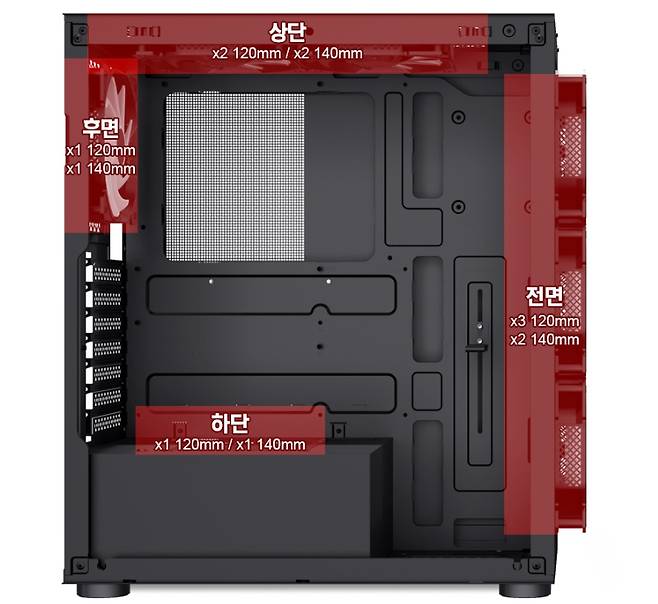 120mm RGB 쿨링팬 3개 장착되어 있고, 140mm 쿨링팬 2개 및 라디에이터 240mm 가능합니다.