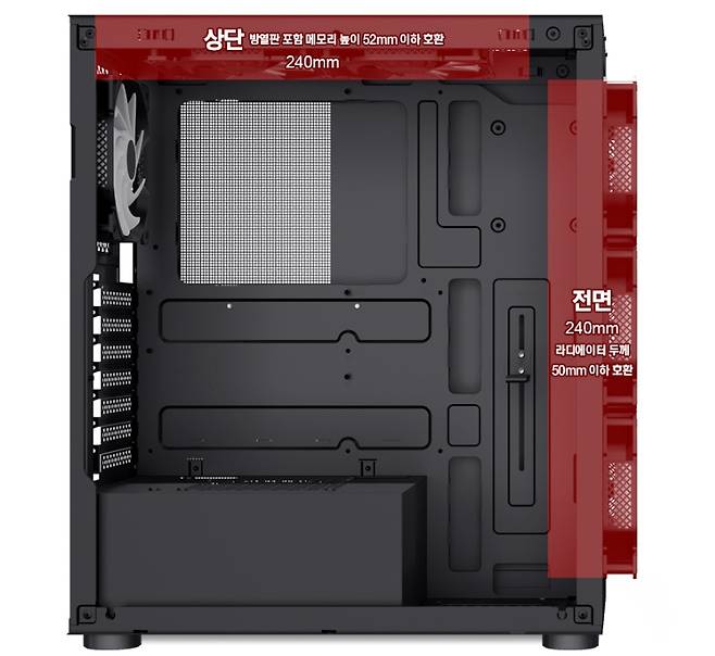 상단부에 240mm까지 지원합니다. CPU 쿨러 최대 장착 높이는 185mm, 그래픽카드