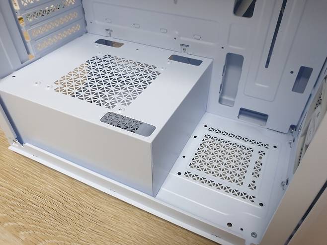 파워 챔버 상단은 부분 타공 되어 있고, 120mm 및 140mm 쿨링팬 1개 추가 장착이 가능합니다.