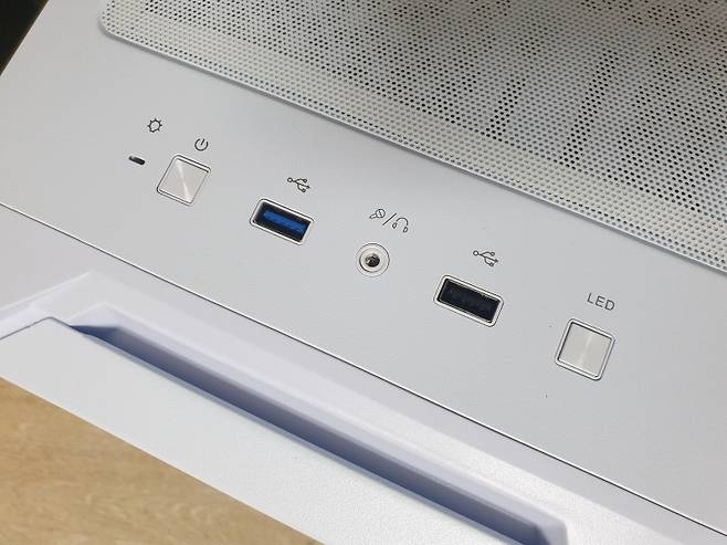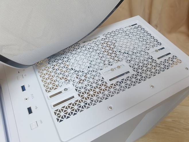 상단에는 탈부착식 자석형 먼지 필터가 장착되어 있고, 앞쪽에 I/O 패널이 있습니다.