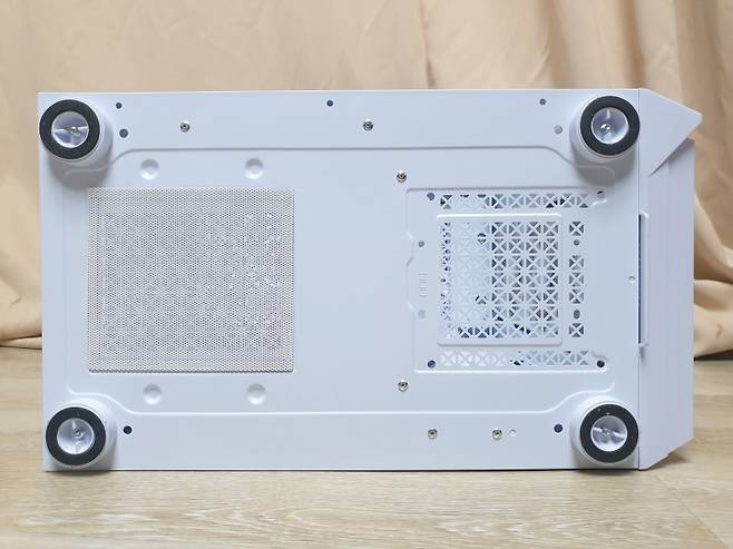 바닥에 받침대 4개가 있습니다. 파워 장착부에 먼지 필터가 있고, HDD 체결부 하단이 보입니다.