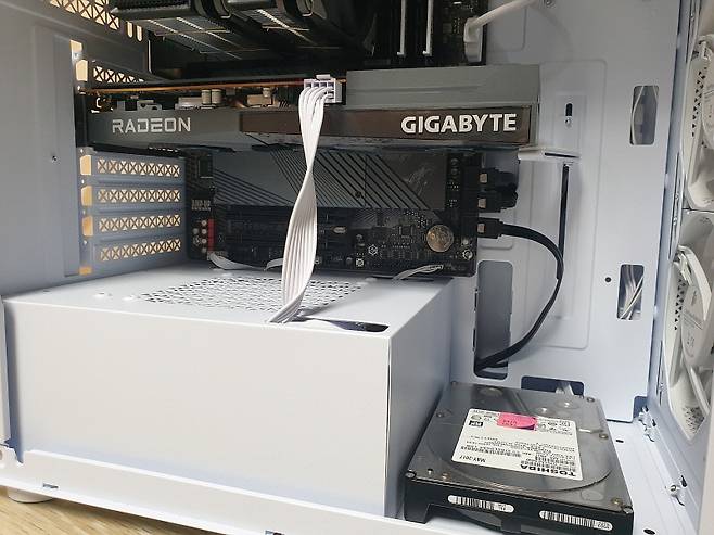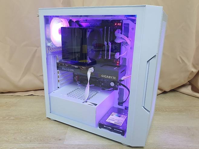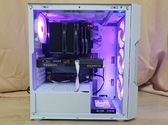 메인보드는 ATX 규격이고, 그래픽 카드는 RX 6600 3팬 모델로 가로 길이는 282mm 입니다.