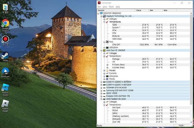 대기 상태에서 CPU 온도는 약 28도이고, 게이밍 환경에서는 CPU 온도는 약 59도 입니다.