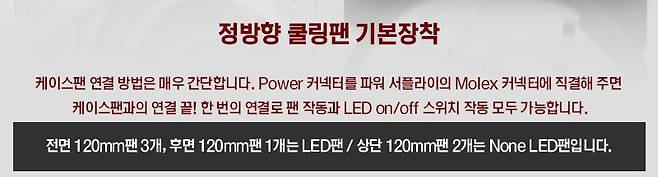 상단부 쿨링팬 2개는 Non LED 이고, 전면부와 후면부 쿨링팬 4개는 RGB LED 입니다.