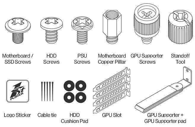 - LED ON/OFF 버튼, 그래픽 카드 지지대 제공