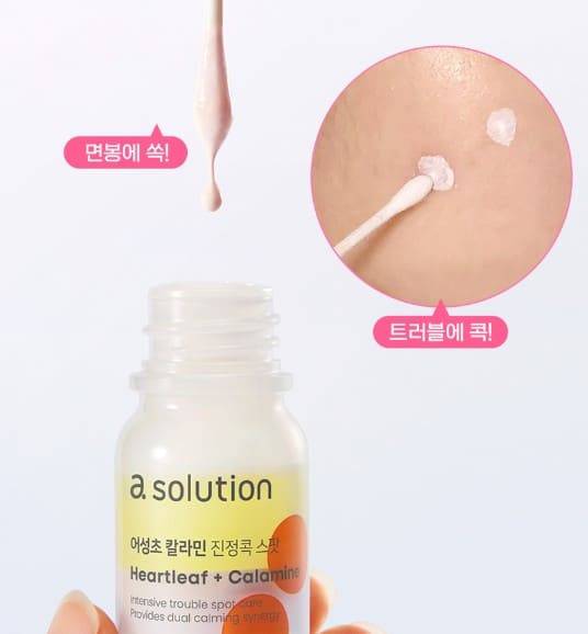 그중 에이솔루션 어성초 칼라민 진정콕 스팟은 어성초 앰플과 칼라민 파우더 제형이 결합된 제품으로, 즉각적인 진정 효과를 제공합니다. 울긋불긋한 트러블 부위에 발라주면 피부를 빠르게 진정시키는 데 도움을 준다고 하네요.