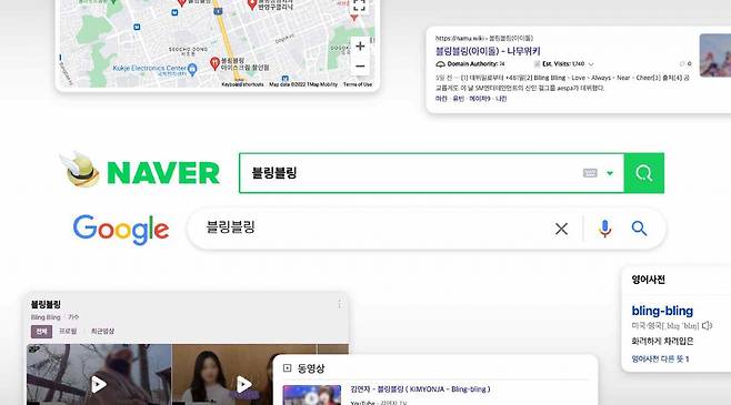 미러볼을 파는 쇼핑몰 이름을 ‘블링블링’으로 짓는다고 가정해 볼게요. 구글과 네이버에 검색을 해보니, ‘블링블링’이란 아이돌이 있네요. 검색 결과 페이지 1페이지 대부분이 아이돌 혹은 블링블링이란 신조어에 대한 뜻이 나와요.