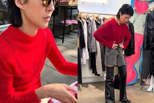 사진 속에는 붉은색 니트를 입은 채 옷을 입어보거나 식당에서 시간을 보내는 홍진경의 모습이 담겼습니다.💕