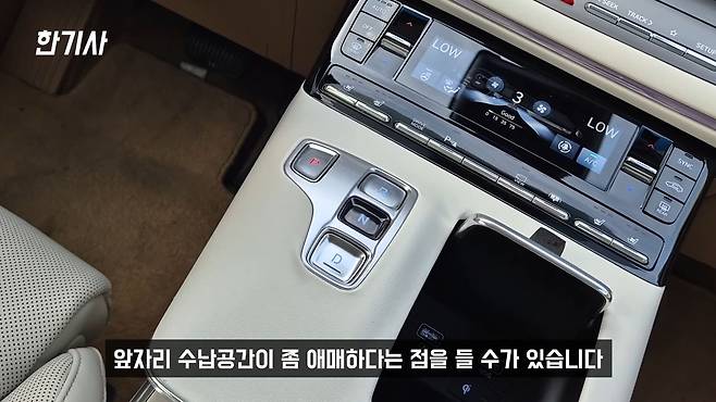 또 다른 단점은 앞자리 수납공간이 좀 애매하다는 점을 들 수가 있습니다. 버튼식 기어가 정말 예쁘긴 한데, 요즘 차량이나 옛날 기어봉 차량들, HG도 사실 공조 있는 공간에 수납공간이 있었거든요. 근데 이 차량의 수납공간이 정말 밑에 있는 공간은 쓰기가 어렵고요. 그냥 넣었다가 꺼낼 일 없는 것만 넣거나, 사실 저는 밑에 방향제를 두고 쓰고 있긴 하거든요. 자주 꺼내고 뺄 때는 좀 불편하고 운전할 때도 좀 위험해요. 진짜 없는 공간이나 마찬가지예요. 사실상 수납공간이라고 하면 여기 암레스트가 전부입니다.