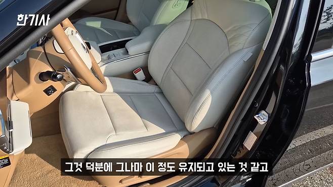 그리고 베이지 시트 관리가 굉장히 어렵습니다. 제가 따로 관리할 자신은 없어서 시트 클리닝이랑 코팅 같은 걸 한번 싹 맡긴 적이 있는데, 그것 덕분에 그나마 이 정도 유지되고 있는 것 같고 제가 스스로 관리하는 거는 거의 못할 것 같습니다. 보통 이런 베이지 시트 같은 걸 하시면 청바지나 이런 거에 좀 이염이 되기 때문에 다른 커버를 하나 씌우시는 차주님들이 많이 계시거든요. 근데 제 마인드는 이제 시트 커버 씌울 거면 왜 골랐냐는 마인드이기 때문에 저는 핸드폰도 절대 필름이니, 케이스 같은 걸 안 씌워요.