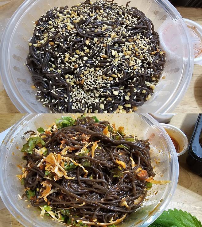 주문한 막국수는 깨와 땅콩가루가 엄청 뿌려져 있다. 막국수 양념은 새콤달콤하다. 야채와 과일을 갈아 만들었다고 한다.