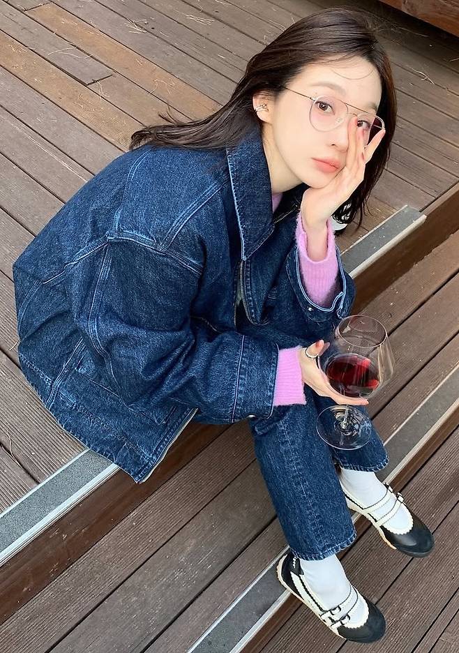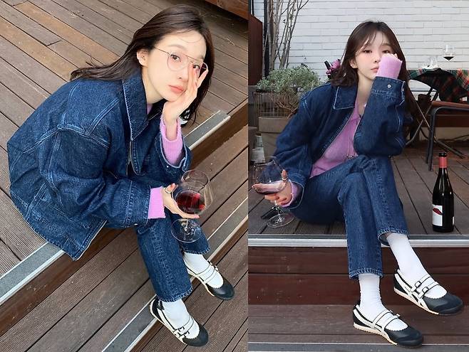 강민경이 빈티지하면서도 세련된 데님 온 데님 스타일링을 연출했습니다.