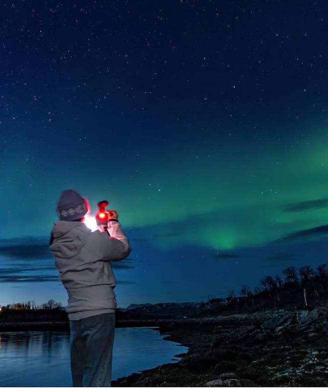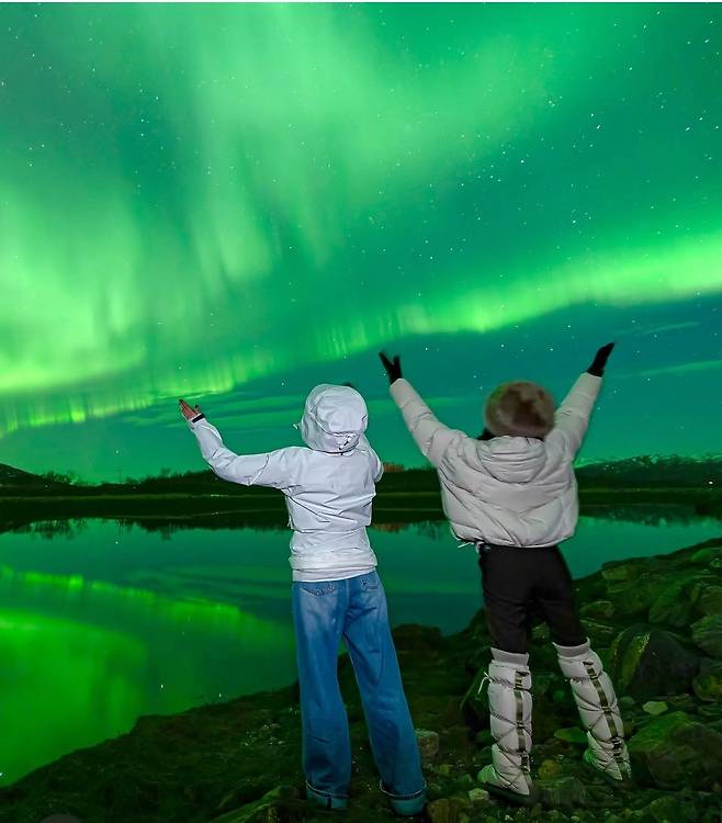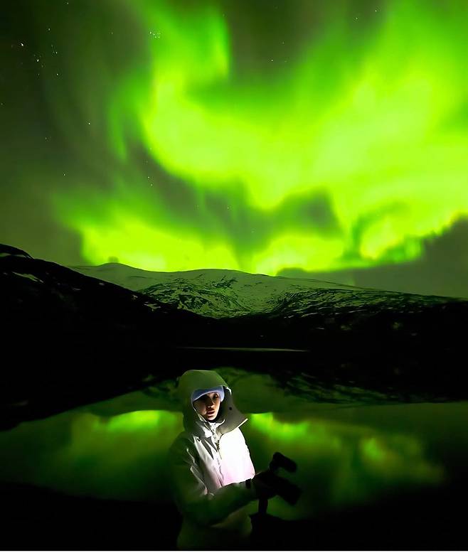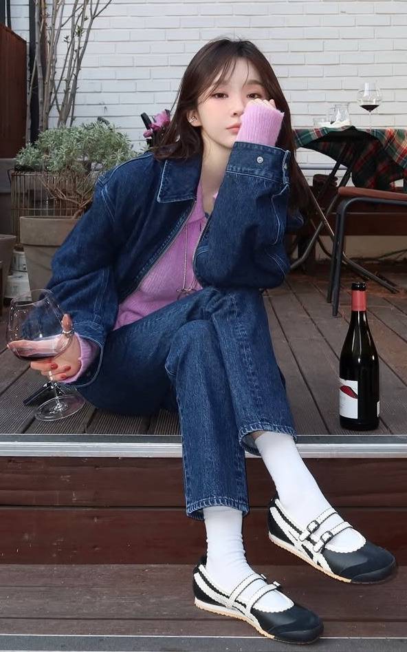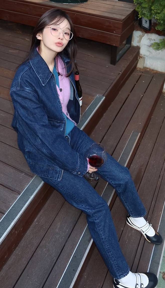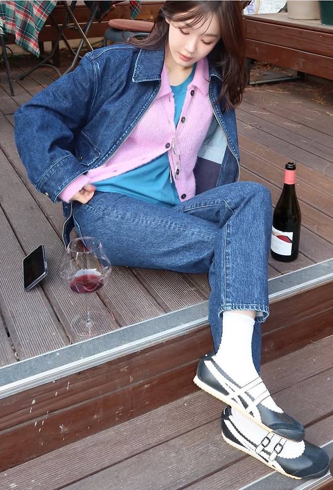 오버핏 데님 재킷과 스트레이트 핏 진을 매치해 여유로운 실루엣을 강조했으며, 이너로는 라일락 핑크 카디건과 청록색 티셔츠를 레이어드해 컬러감 있는 스타일링으로 생기를 더했습니다.