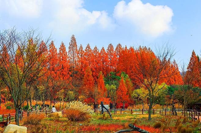 전라남도 산림자원연구소는 낭만적인 도보 여행을 할 수 있는 메타세콰이어길이 펼쳐지는 명소입니다. 알록달록한 잎으로 하늘을 가리고 긴 단풍 터널을 만들어내 힐링 여행으로 제격입니다.