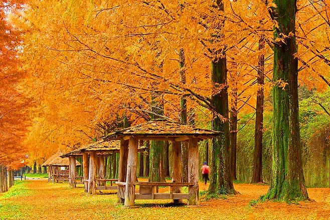 담양 메타세쿼이아 가로수길은 걷기 좋은 명소로 가을이 되면 주홍빛, 노란빛으로 화사하게 물들여지며 바닥에 알록달록한 나뭇잎이 가득해 온 세상이 주홍빛으로 빛나는 것 같은 느낌을 선사합니다.
