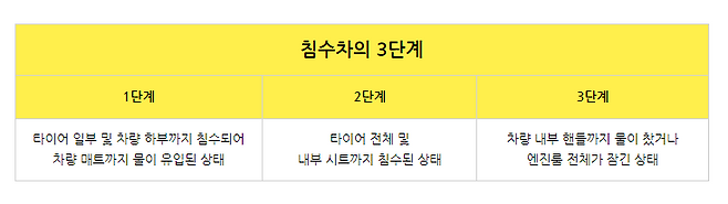 기본적으로 침수차라는 기준은 차량 실내로 물이 유입이 되어 매트가 젖을 정도라면 침수 기준의 범위로 들어가게 되는데요. 침수도 단계별로 나뉜다는 사실, 혹시 알고 계셨나요?